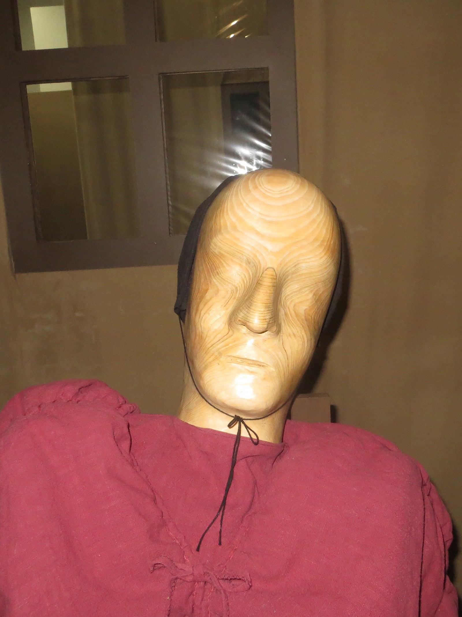 The duo of artists creates sets invariably inhabited by characters. In Embrun, there are nine of them. They include Gorbes, the dog trainer, Pascal Labourgue, the potato seller, and Tristane, his magician daughter. They all look the same, one metre sixty in height, with wooden heads and feet carved from cedar, and bodies made from linen in shades of off-white and anthracite grey, combined with a little orange, pink and blue. They share the same absent air as if everything were happening outside of them. The eyes and mouth, where the emotions lie, are represented by a discreet relief or a delicate hollow. For Angélique Aubrit and Ludovic Beillard, the place accorded to things is enough to embody them. Feelings are experienced, invented rather than represented.